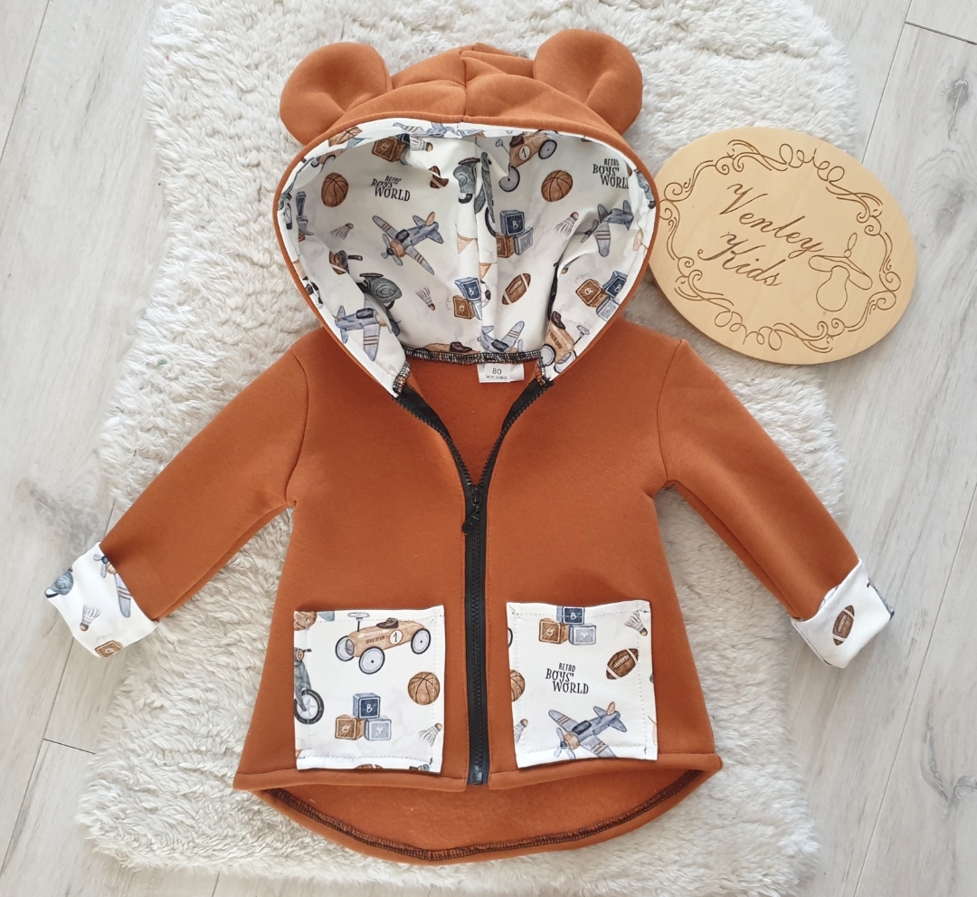 Płaszczyk przedłużany, z kapturem i uszkami. Kieszonki oraz wewnątrz kaptura ozdabiany wzorem