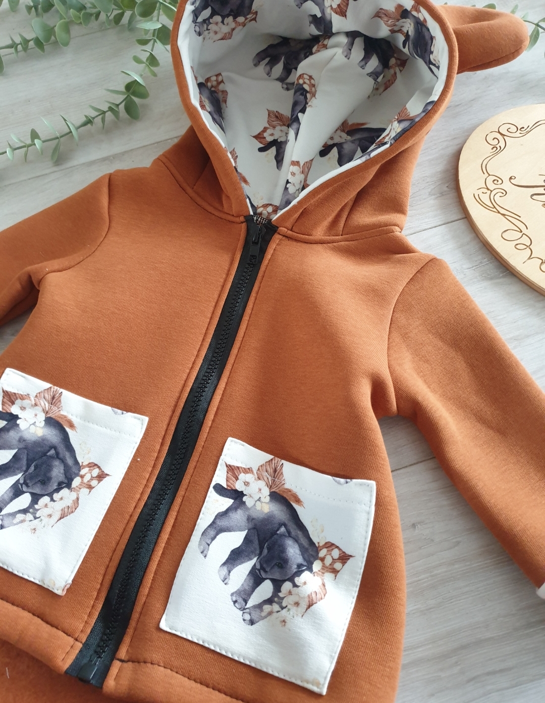 Płaszczyk przedłużany, z kapturem i uszkami. Kieszonki oraz wewnątrz kaptura ozdabiany wzorem DŻUNGLA