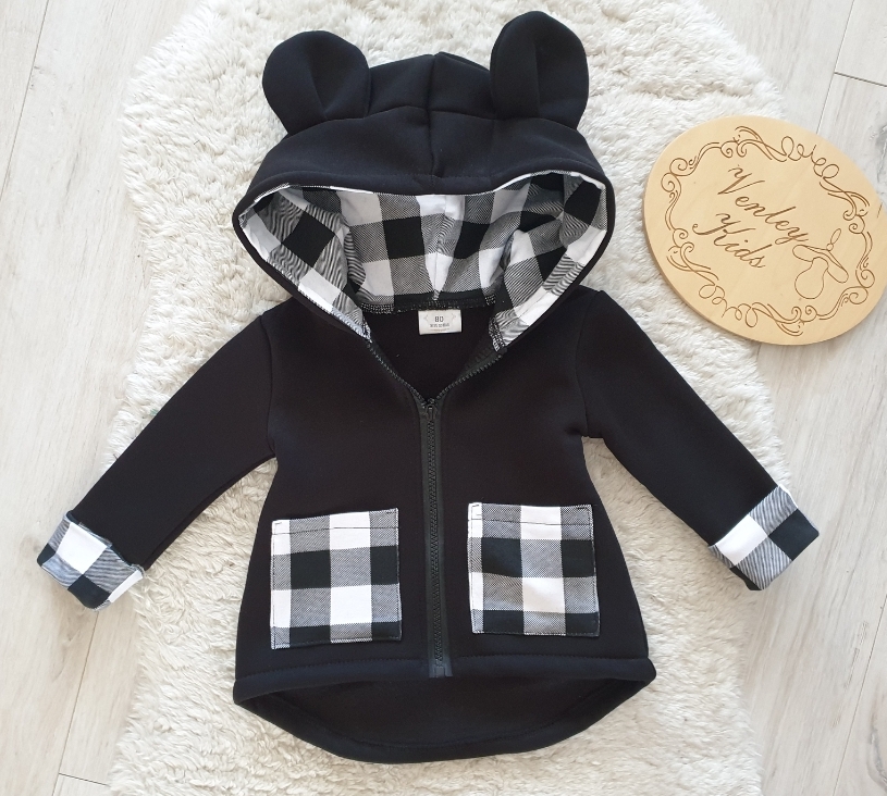 Płaszczyk przedłużany, z kapturem i uszkami. Kieszonki oraz wewnątrz kaptura ozdabiany wzorem