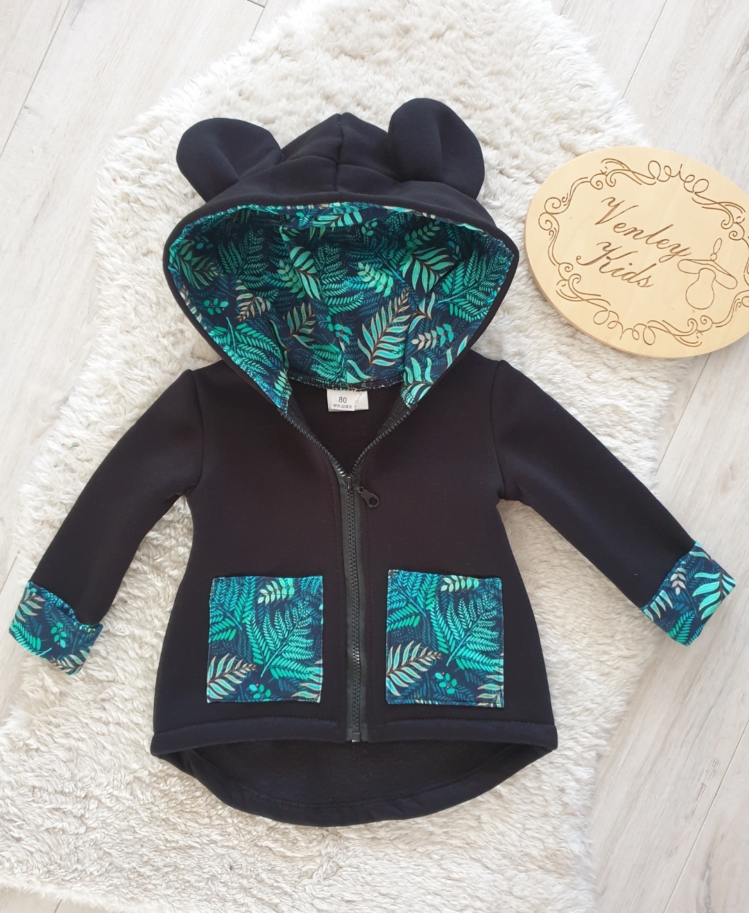 Płaszczyk przedłużany, z kapturem i uszkami. Kieszonki oraz wewnątrz kaptura ozdabiany wzorem