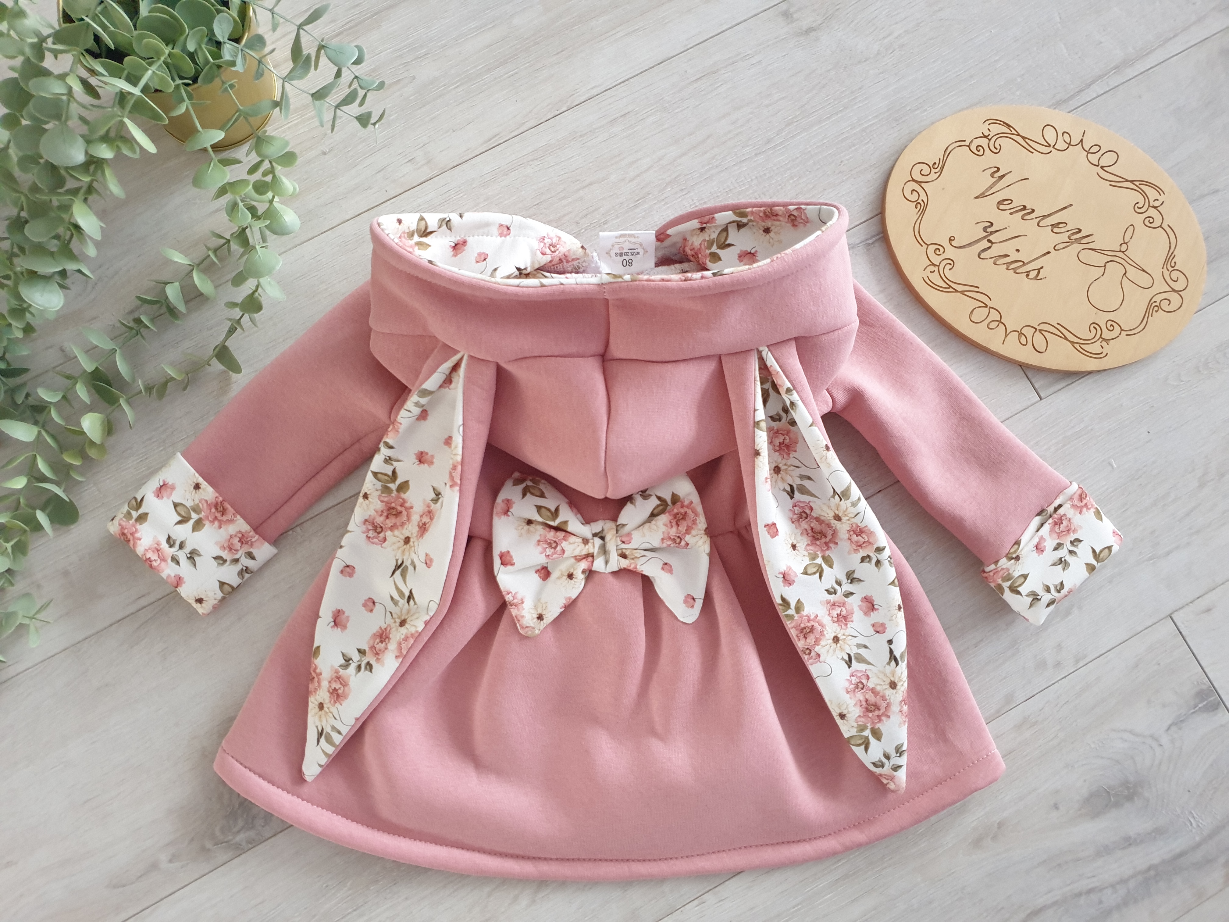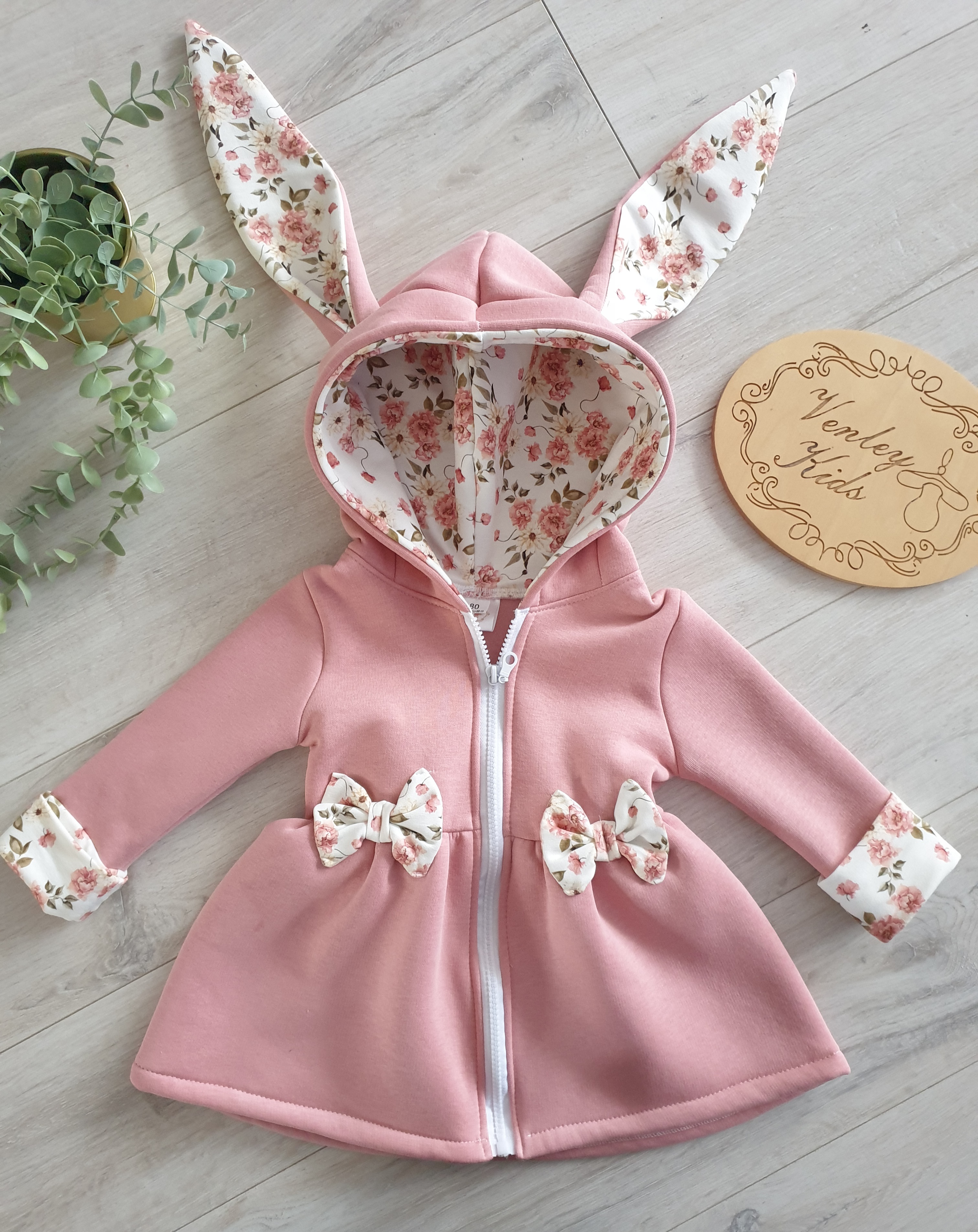 Płaszczyk przedłużany - rozkloszowany , z kapturem i uszkami królika . Kokardki oraz wewnątrz kaptura ozdabiany wzorem