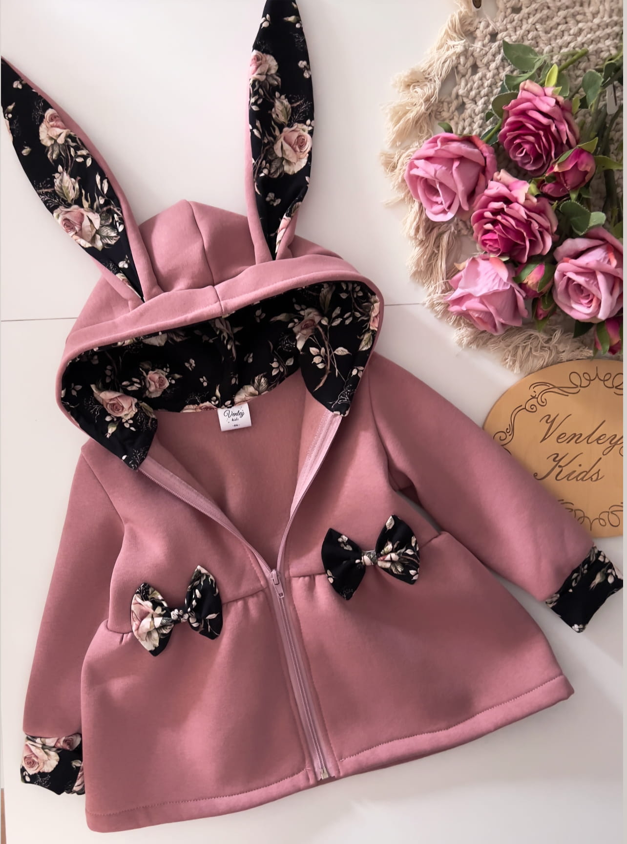 Płaszczyk przedłużany - rozkloszowany , z kapturem i uszkami królika . Kokardki oraz wewnątrz kaptura ozdabiany wzorem