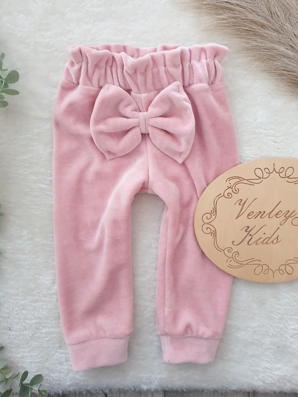 Spodnie wysoki stan z KOKARDĄ welur kwarc