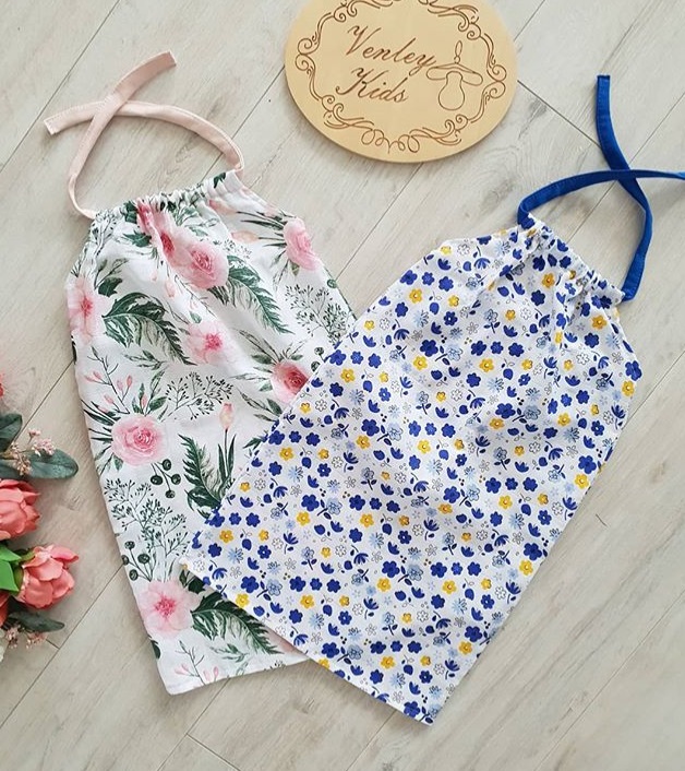 Sukienka z delikatnego muślinu, wiązana na szyi, z tyłu na pleckach gumeczka podtrzymująca sukienkę.