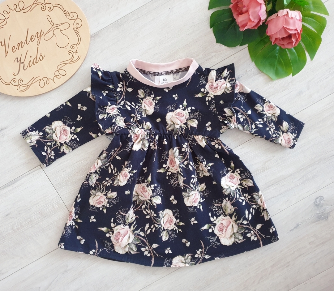 Sukienka RÓŻE NA CIEMNYM z rękawkiem