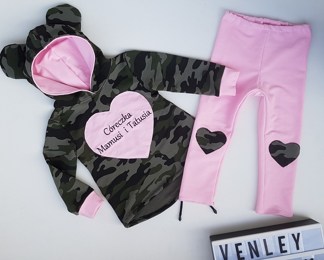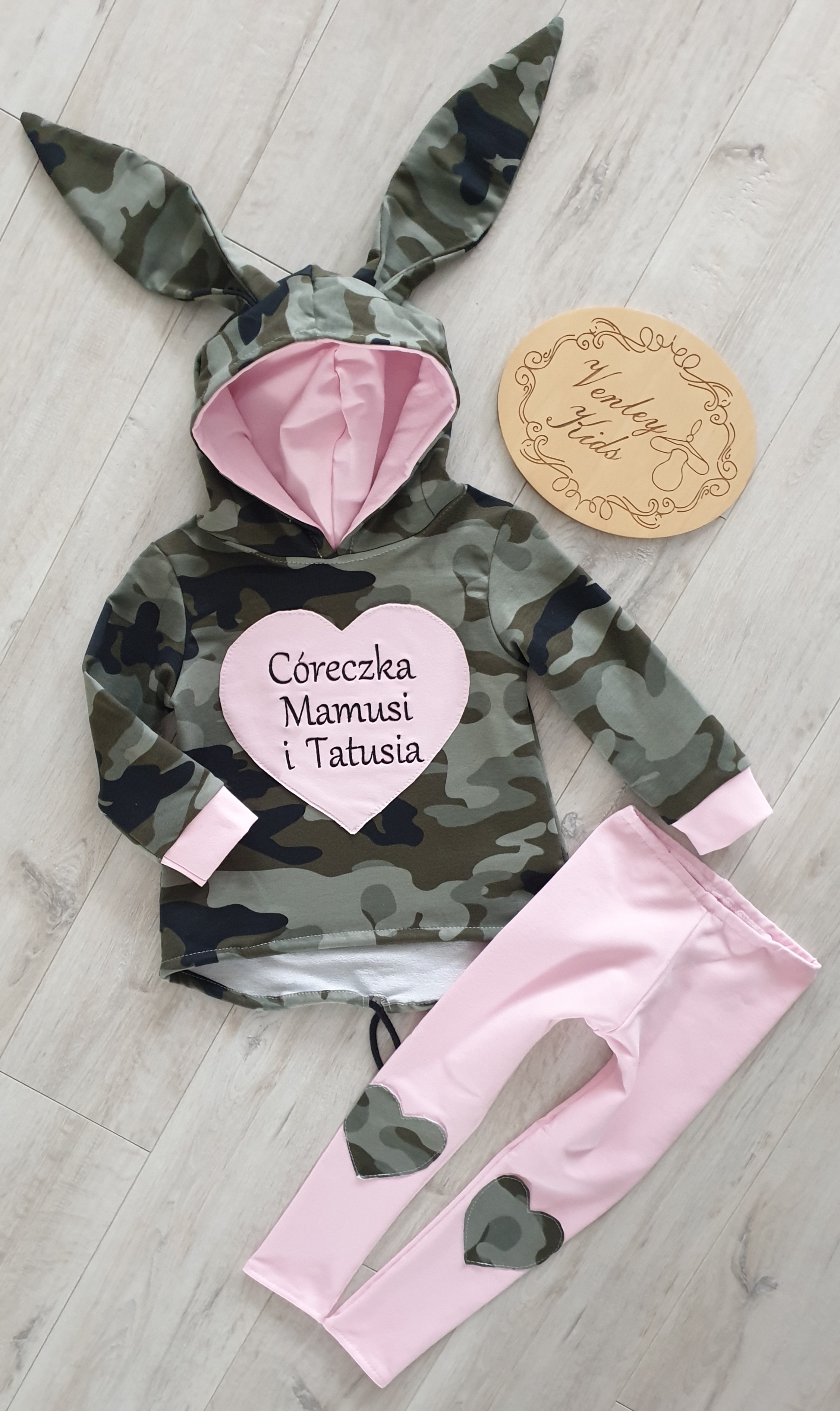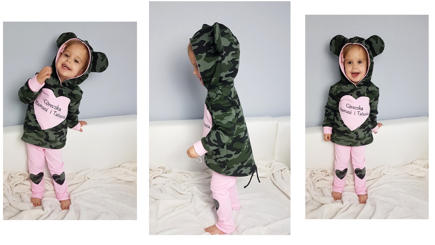 Przedłużana bluza z uszkami MIKI lub KRÓLIKA, moro z dodatkami pudru. Napis na serduszku jest dowolnie WYHAFTOWANY -> TEKST