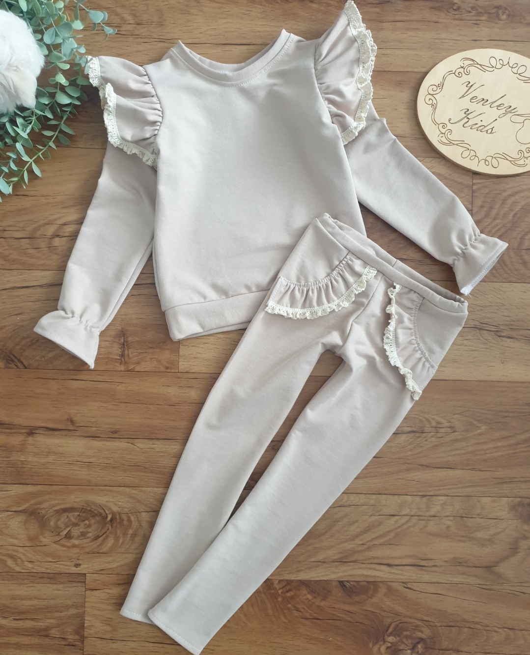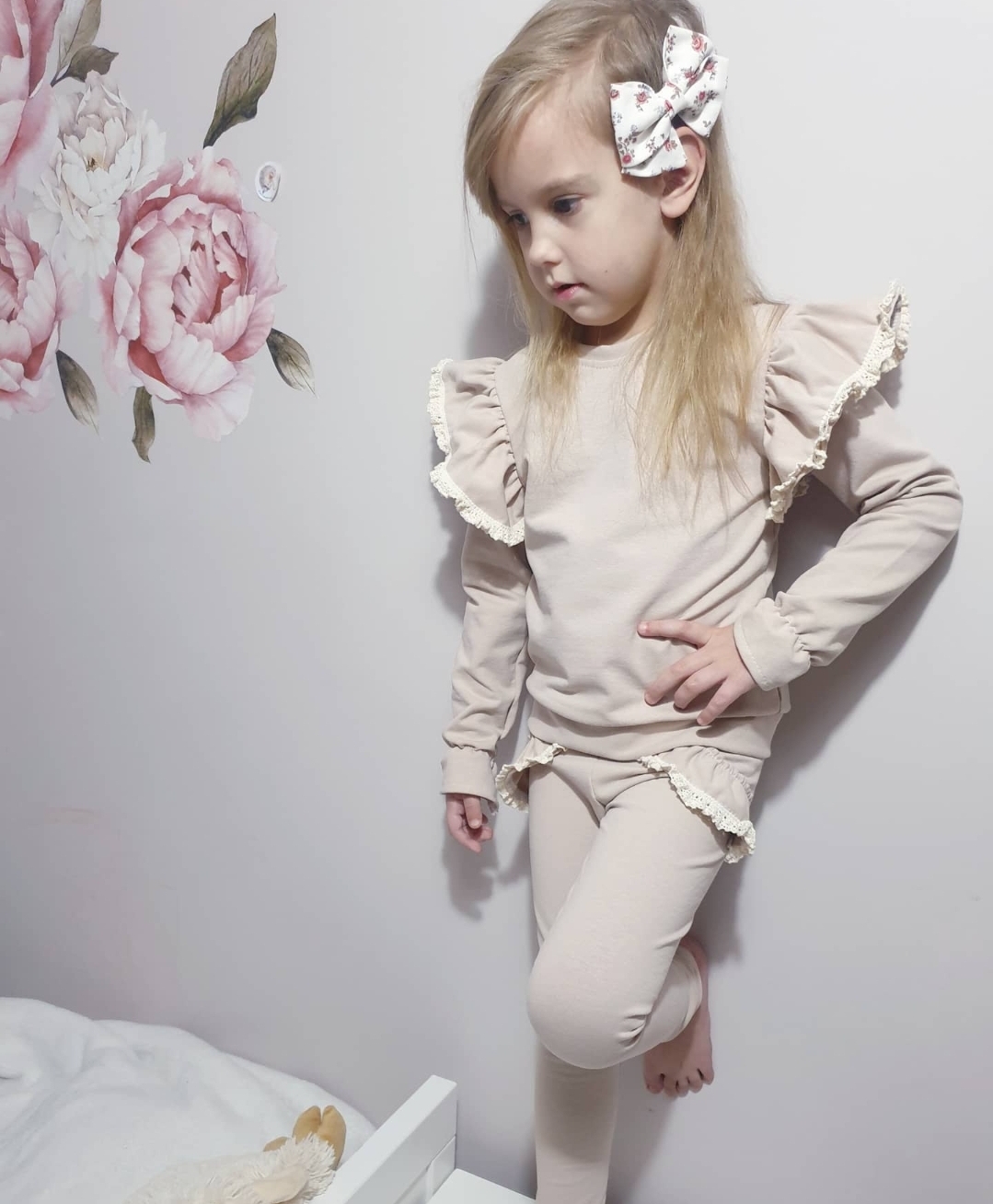 Leginsy z falbanką imitującą kieszonkę ozdabianą koronką