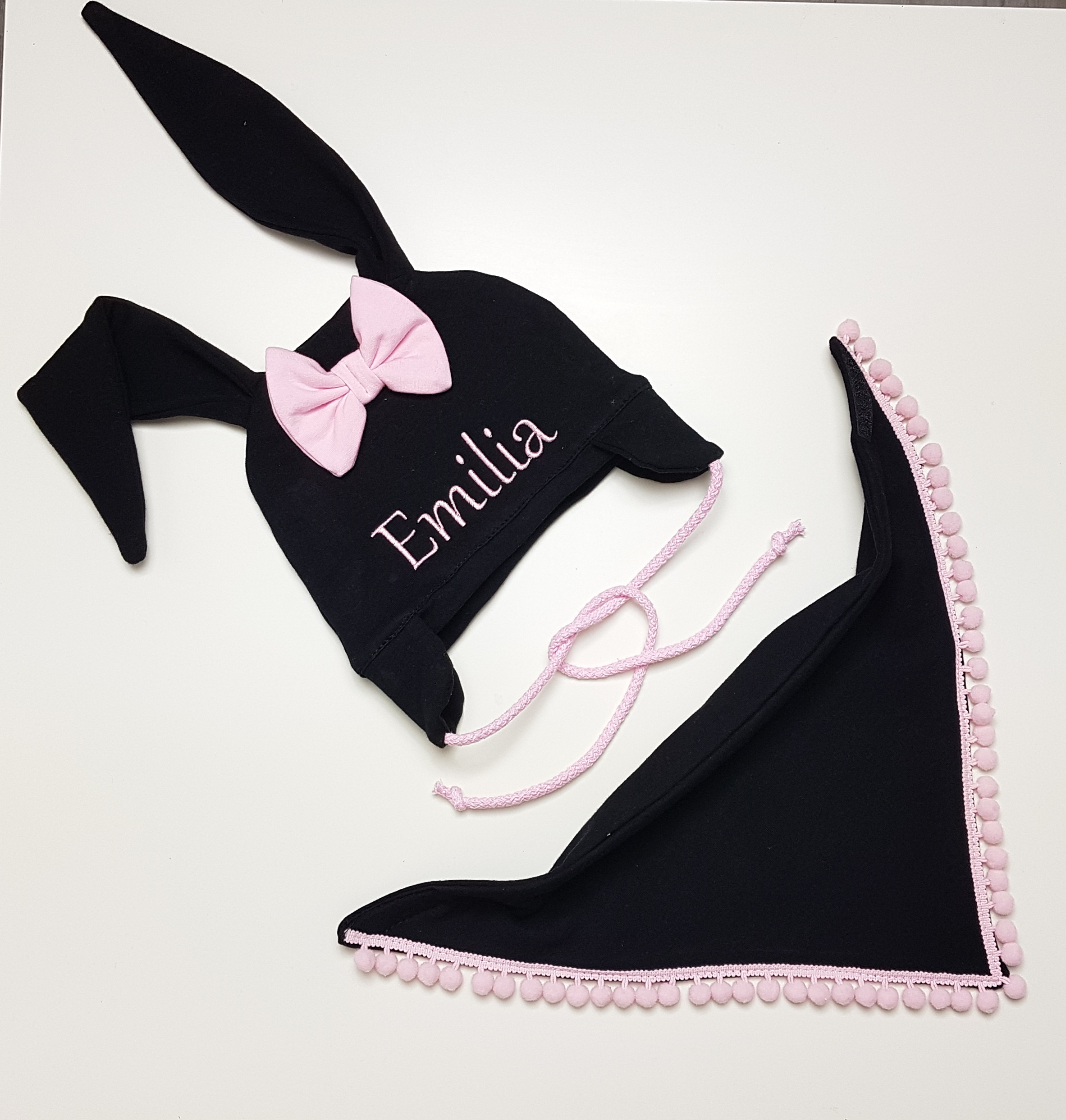 Czapeczka z uszkami królika , ozdabiana kokardką , imię na czapeczce jest dowolne -> IMIĘ